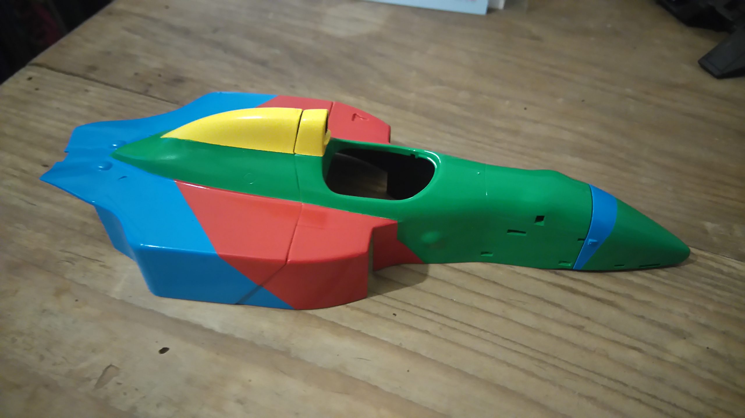 I sprayed all four of those lovely bright colours on using Tamiya rattle cans. That was a fun job! Probably my most difficult spraying job to date, and aside from a few small bleeds it came out pretty well. As the defining feature of the car is the colours, it was critical that I got them right, so I spent the most time getting the masking as accurate as I could. The colours I used were:
