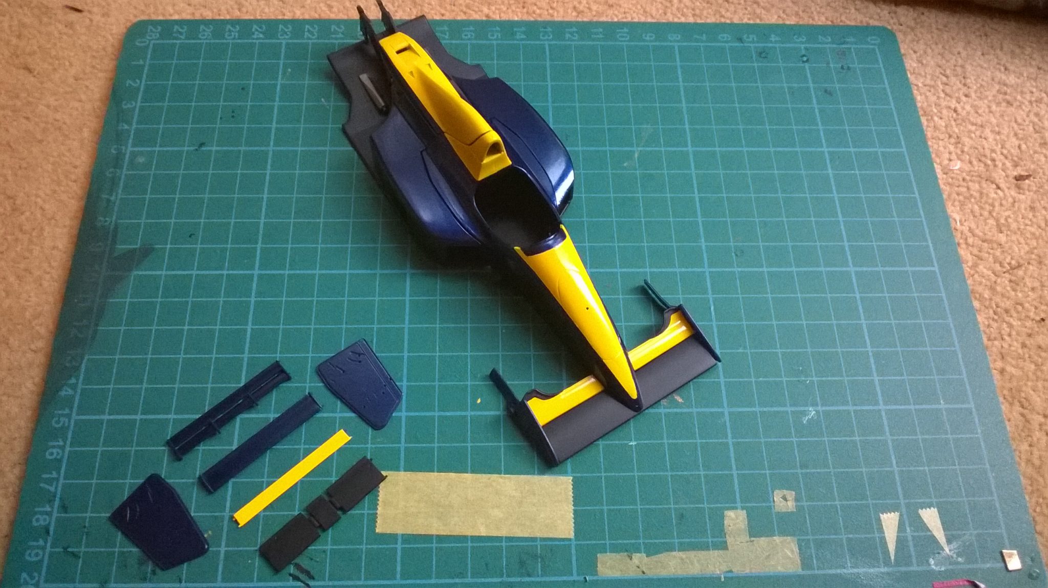 I sprayed the yellow onto the car first, normal Tamiya TS16 out of the can, over a white base. Once dry, I masked the yellow and sprayed the car in Tamiya TS51, again out of the can. This metallic blue is very likely the incorrect shade, but it’s difficult to tell what exactly the colour was, and I was (and still am!) happy with the result. TS8 was sprayed onto the engine cover for the red section, meaning all the car’s main colours were painted.
