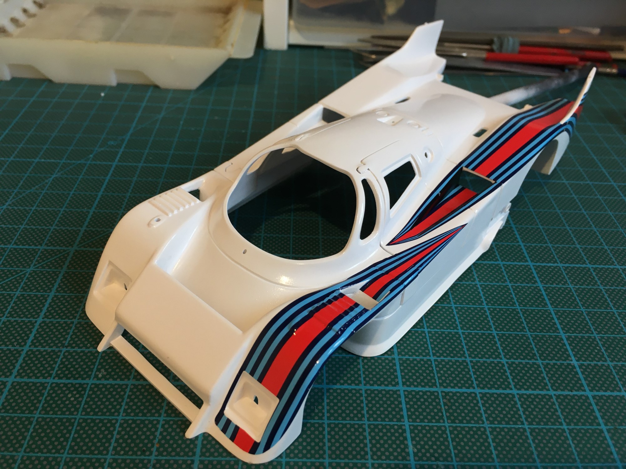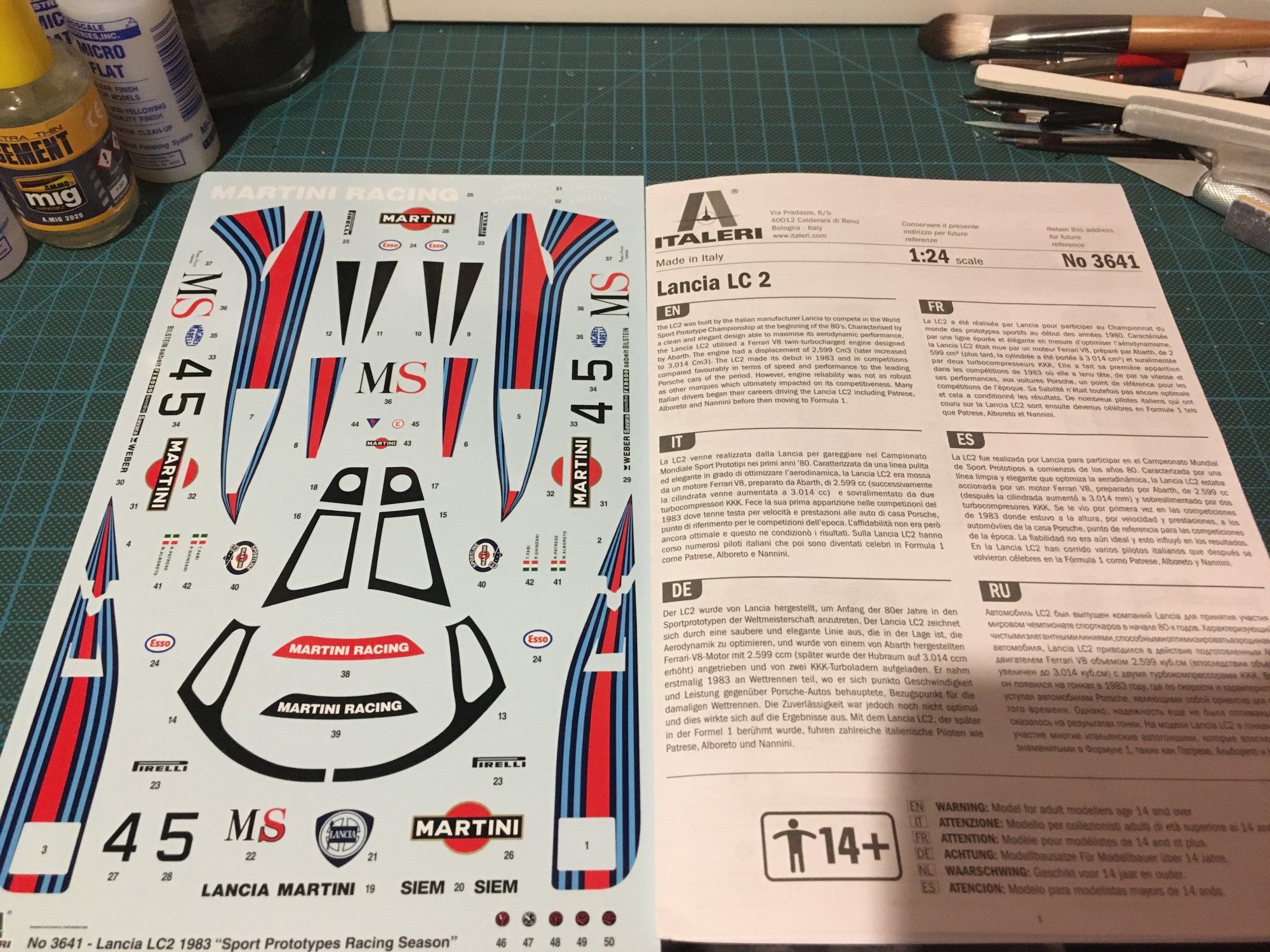 My conclusions after building the Italeri Lancia LC2? The complex decals need patience and a lot of Micro Set. But otherwise construction is simple, so if you can look past the decals, this is a nice kit to start off with. For someone looking for an accurate depiction of an LC2 from 1983, you’ll need to make a lot of modifications and spend at least as much again on the kit to get it up to a reasonable standard. I suspect that, even with Italeri’s re-release, this will remain a fairly rare kit. It’s not a very famous car and wasn’t that successful, but it is another Martini livery, so I’m very happy to have it in my collection! It certainly won’t be the focal point on my shelf with the errors I’ve made, but it’s a nice looking car nonetheless, and I’m glad I have it finished.
