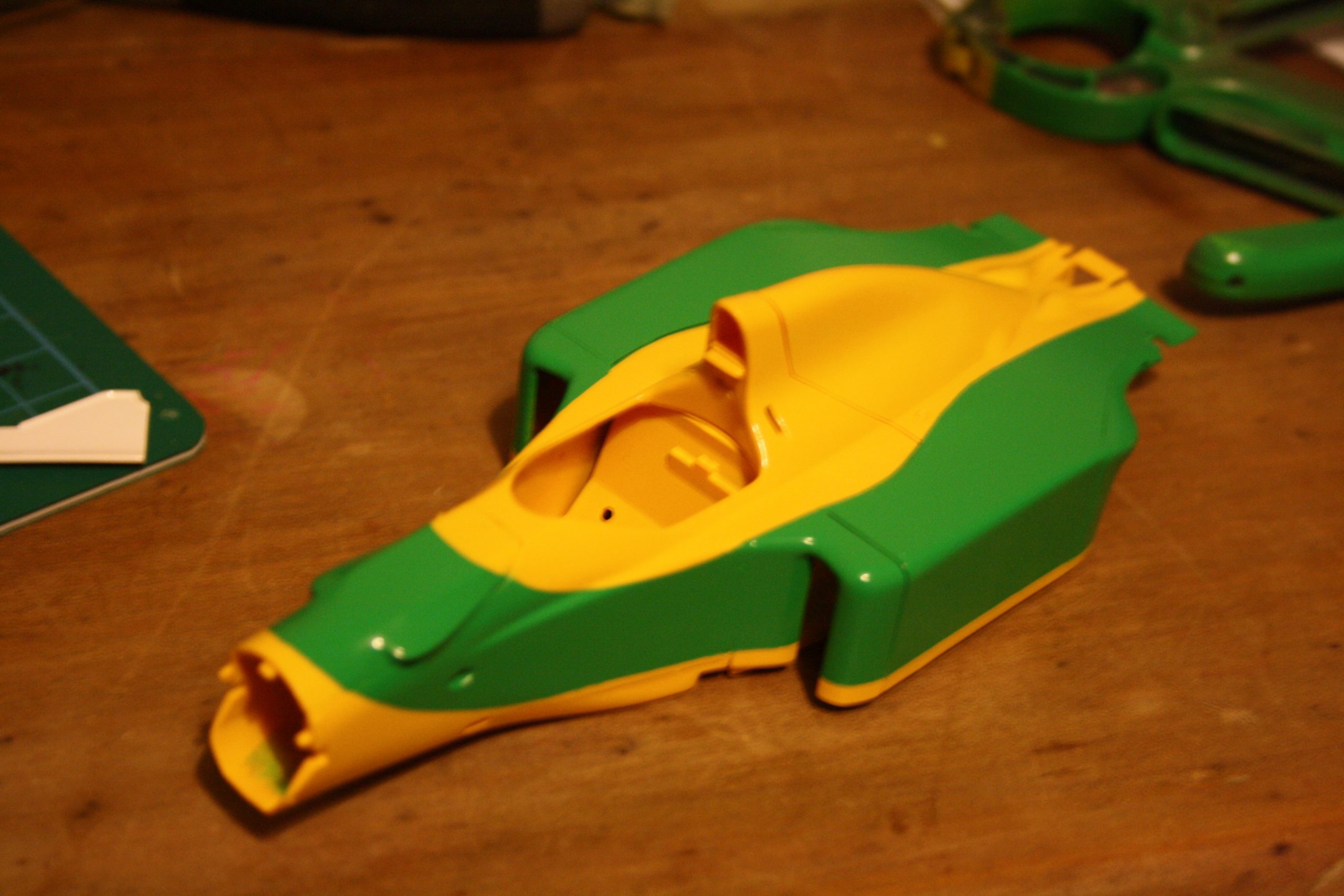 With the masking template on, I sprayed TS35 Park Green onto the body, instead of the green decals. And as I peeled the tape off, whaddya know, there was the lovely yellow and green Benetton livery looking fantastic! There were a few areas to be cleaned up, but fundamentally the job was a successful one. The demons had been banished!